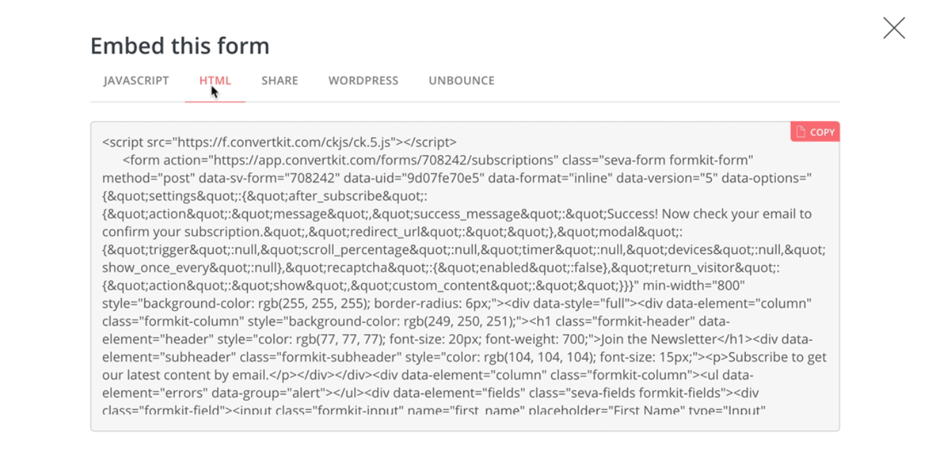 It’s also possible to use the JavaScript embed snippet using the site-wide code injection feature in Ghost. This is especially useful if you’re using the modal or slide in formats that ConvertKit offer, if you’d like the form to appear on every page.