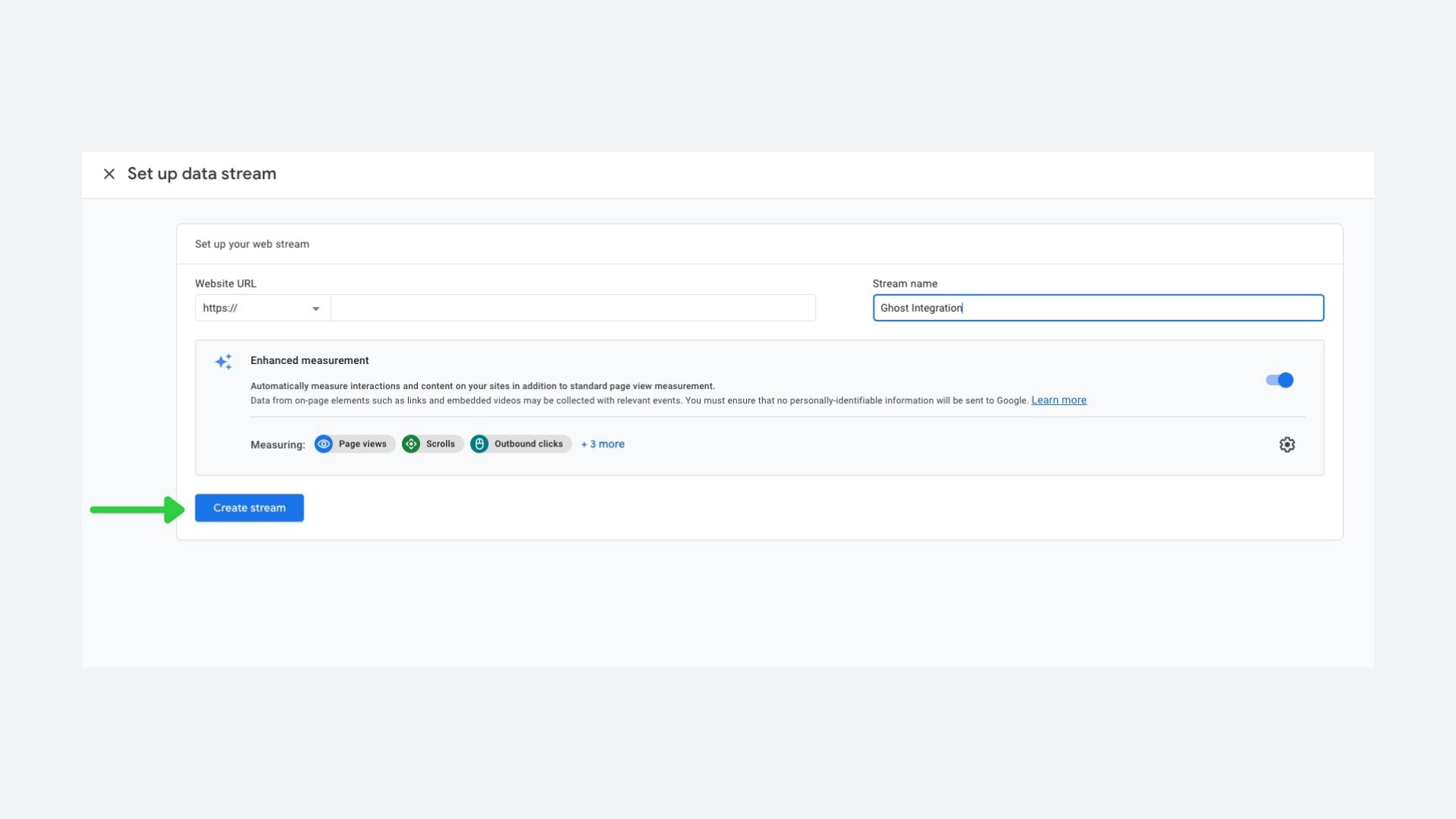 Enter the URL for your website (like demo.ghost.io) and a stream name (like “My Ghost Site”). Choose the options you want to enable and click Create stream.