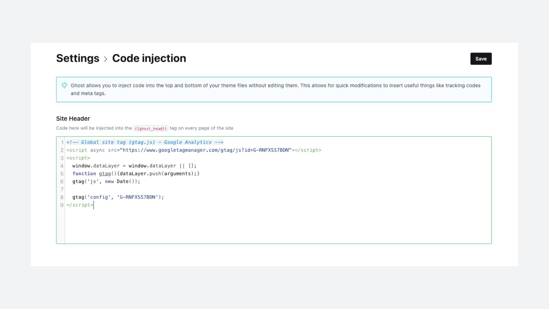 Google Analytics requires the tracking code to be added to <head> of each page on your site, so paste the copied code into the Header section and hit Save.