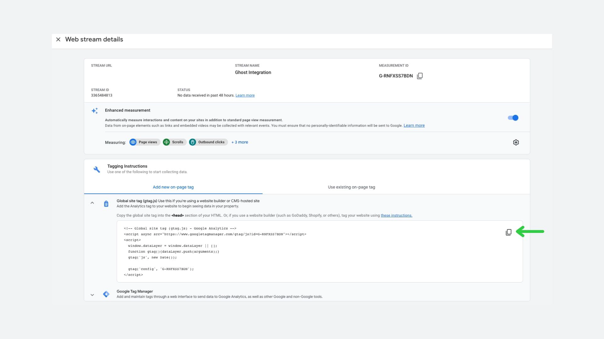 Once your stream is active, you’ll see an option to add a global site tag.